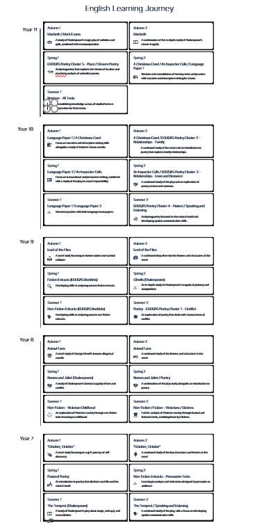 In Y11, Students will complete their study of poetry and Macbeth and complete their English Language study booklets.